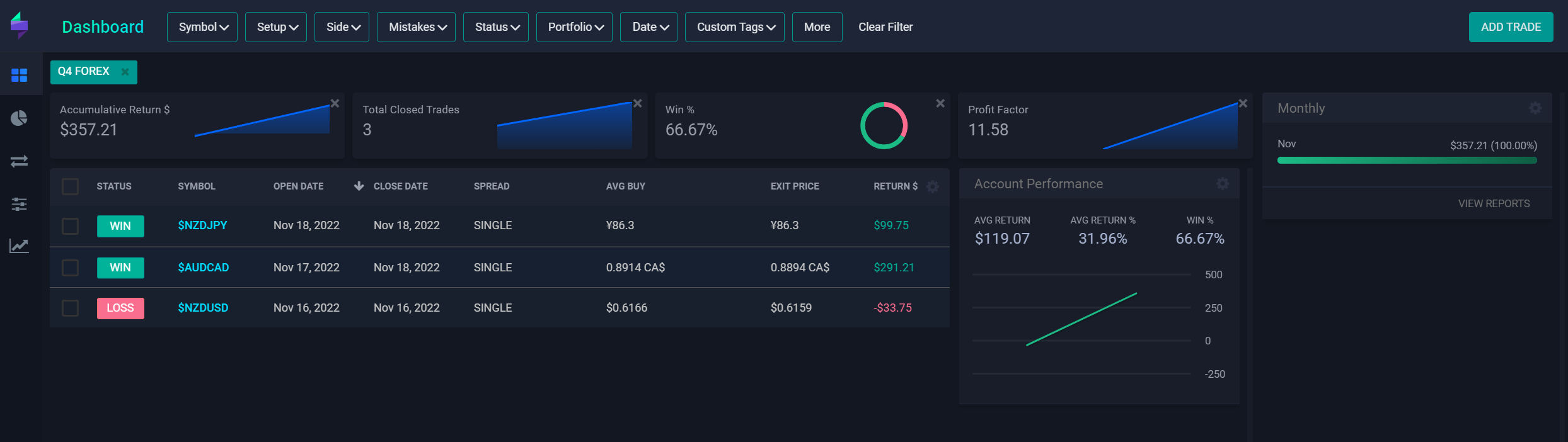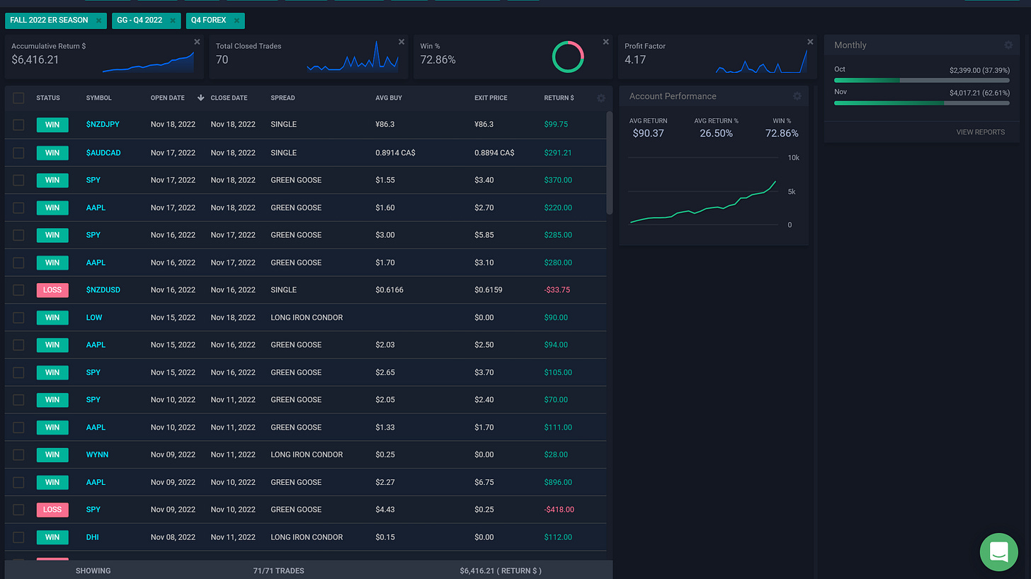 The below are all of my trades to date this quarter. They include three distinct systems and asset classes: ER Trades (IV related option trades), GG (Overnight Gap System with options), and Forex/Futures.