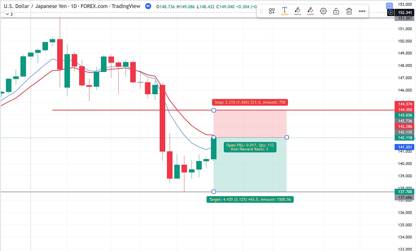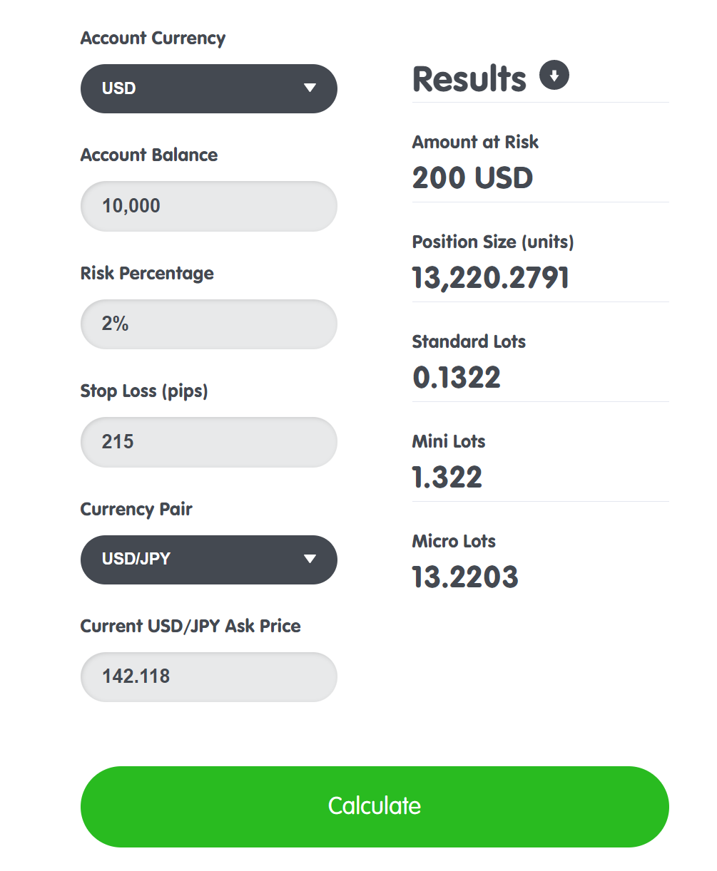 Selling 13,220 units of USD.JPY at 142.135 with a stop loss at 144.35 results in a risk of $200. Note that Foreign Exchange is traded on margin, with the usual amount being 100 to 1. In this example an account would incur a $132.20 margin hold.