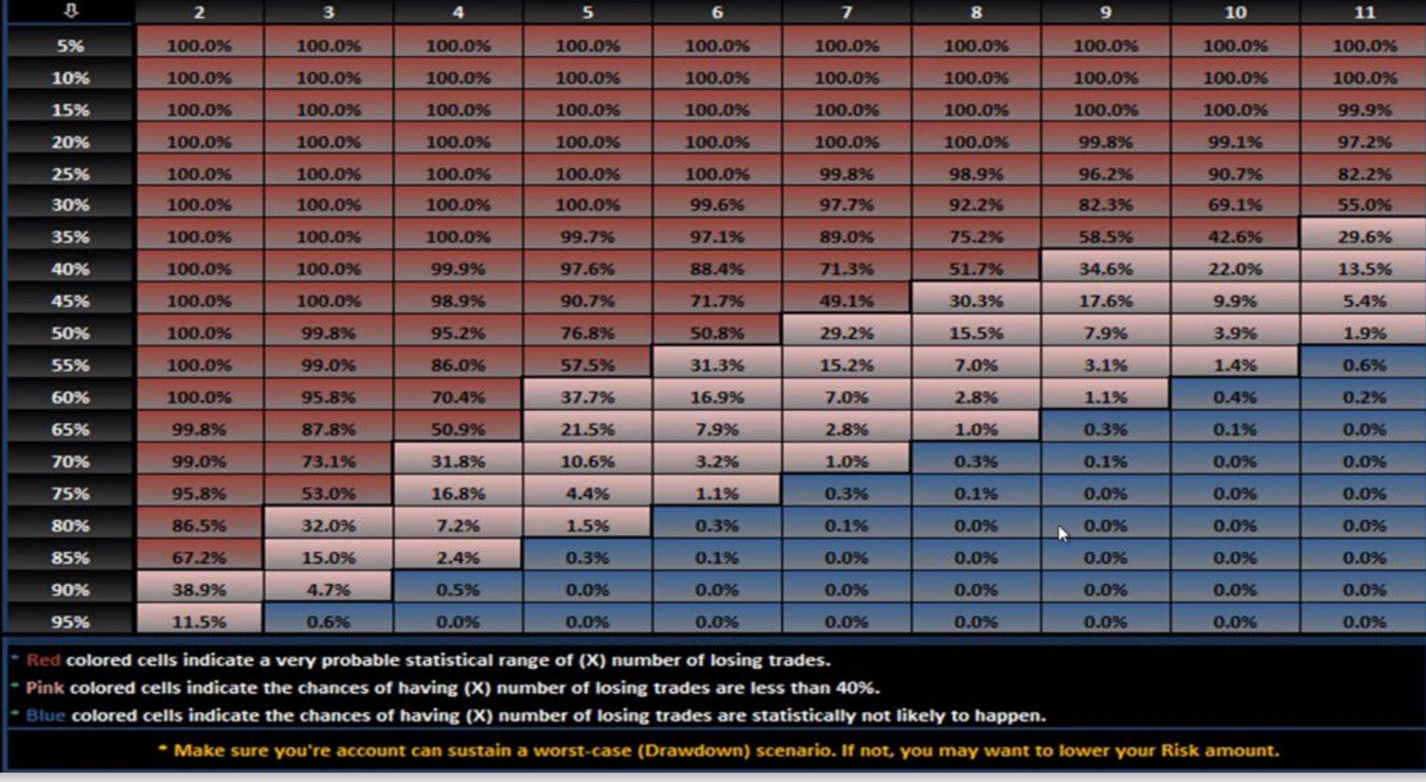 The above table represents the probability of consecutive losses vs. a traders win/loss ratio in over 100 trades. If you are a 50% trader, you theoretically have a 37.7% probability, at some point over 100 trades, of achieving 5 losses in a row; If you are a 60% trader, you would have a 7% probability of realizing 7 losses in a row.