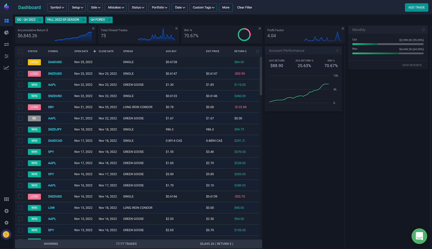 Fall Earnings Season 2022 is wrapping up. Below are the final plays for the season. Also - going forward until through December and January until the next ER season, I’ll be spending more time writing about Foreign Exchange trading, systems, and opportunity identification. Premium readers on my Telegram channel may see an occasional FX alert at the end of the day, based on the daily candles (at around 4:15 to 4:30 Wall Street Time.