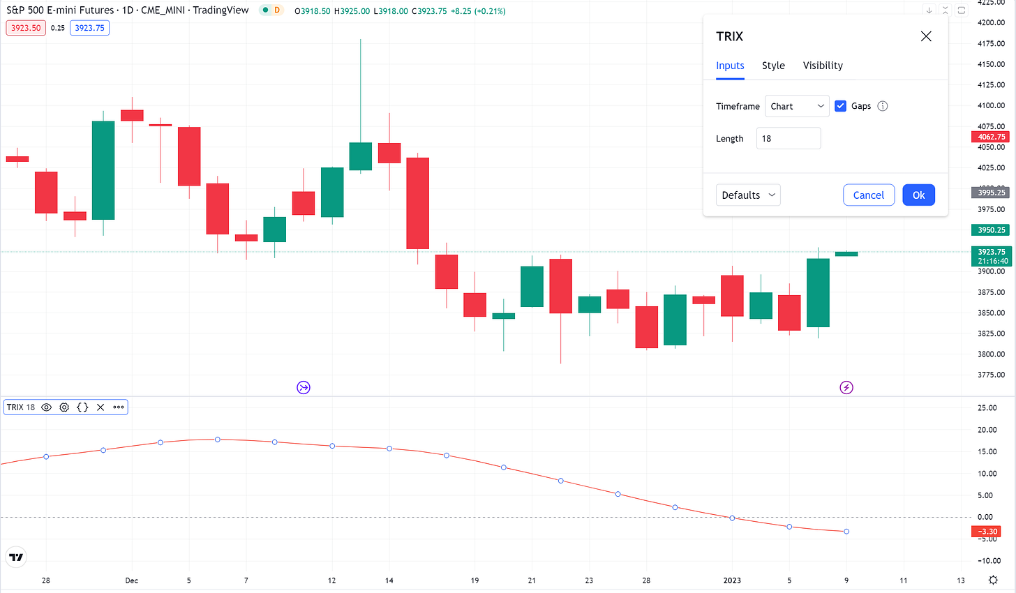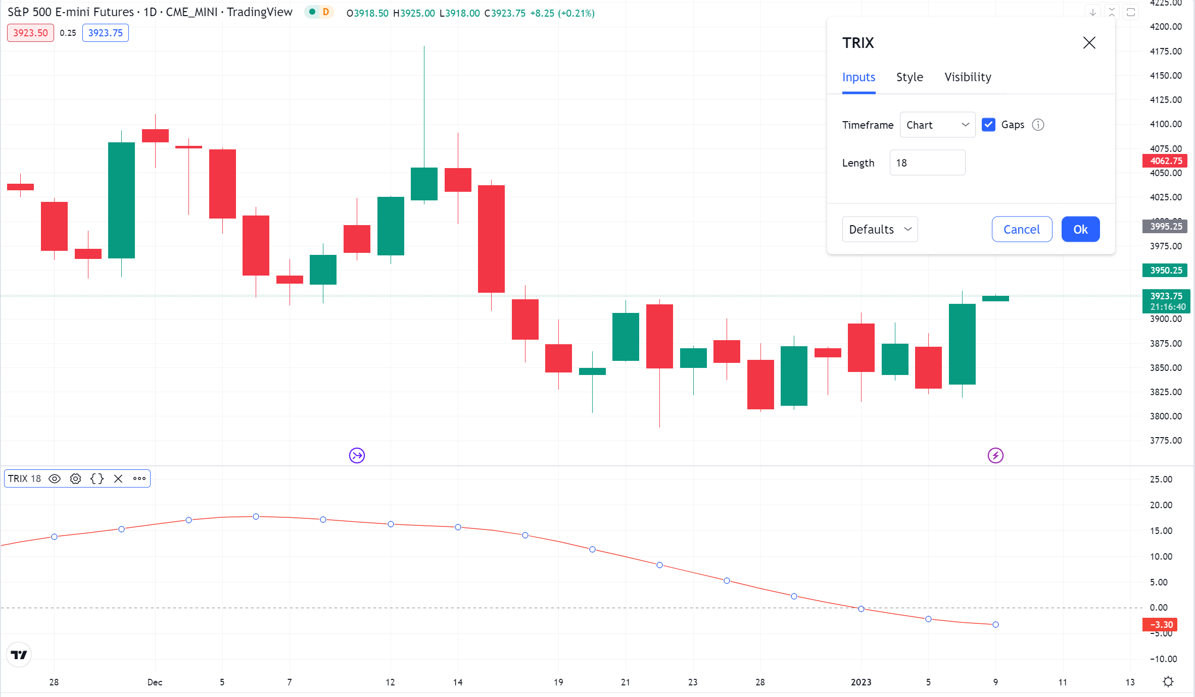 The standard TRIX settings are shown below, which shows that ES! is bearish. Again, I don’t use standard settings.