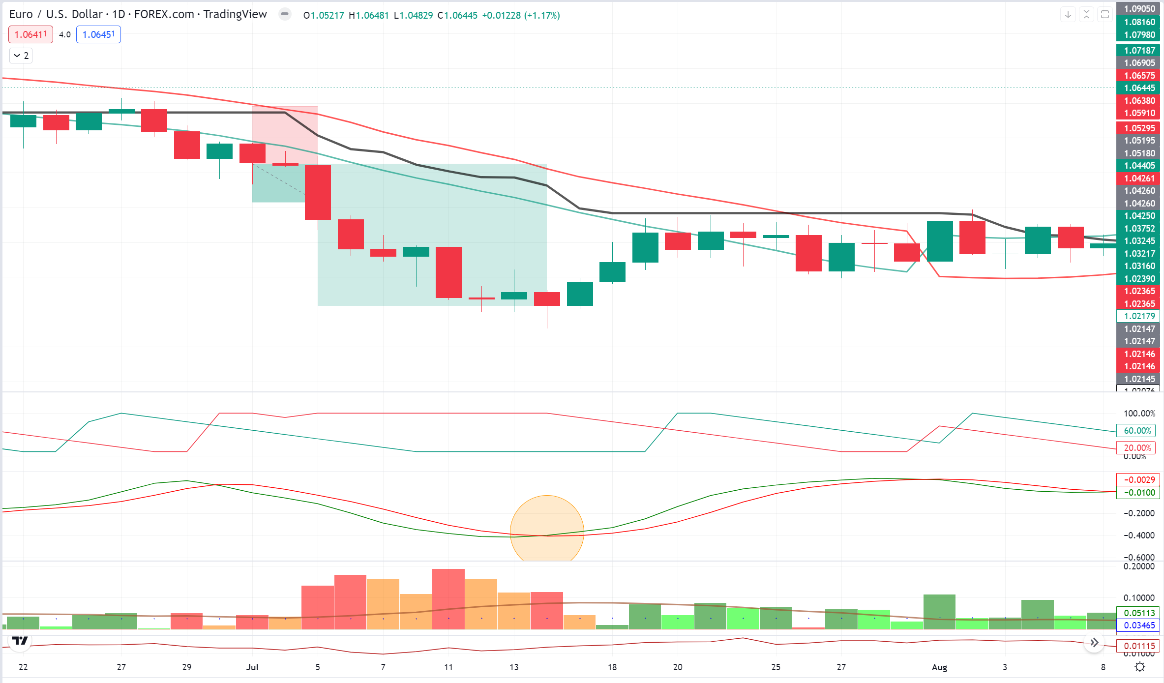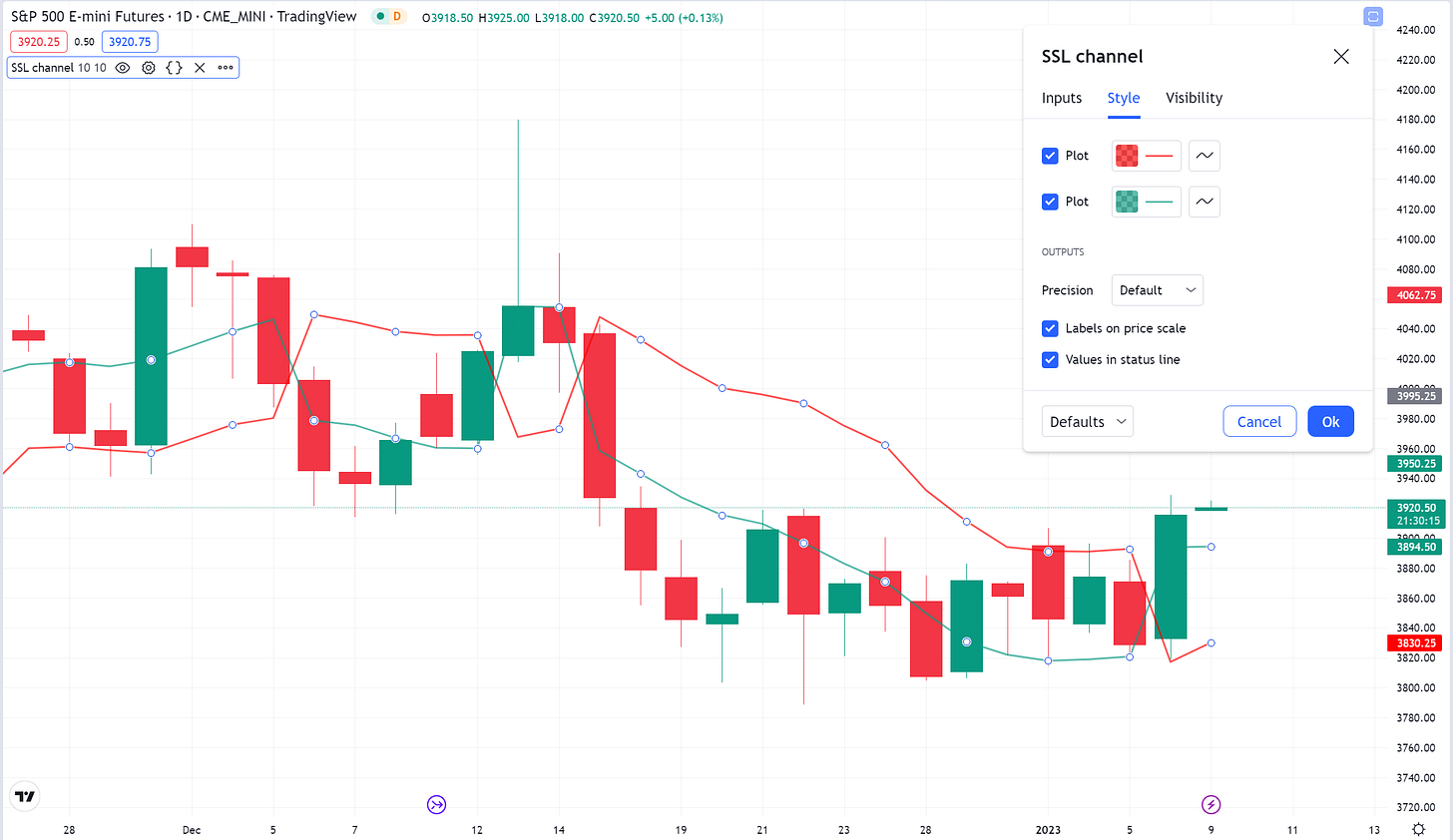 The SSL is an indicator that combines moving averages to provide you with a clear visual signal of price movement dynamics. In short, it's designed to show you when a price trend is forming. It shows you two different-coloured lines that follow the evolution of prices. When the two lines intersect, the indicator signals that the price movement is changing direction or is about to. When the bullish line (I use green) is above the bearish line (I use red), the trend is bullish; when the bearish line is above the bullish line, the trend is bearish.
